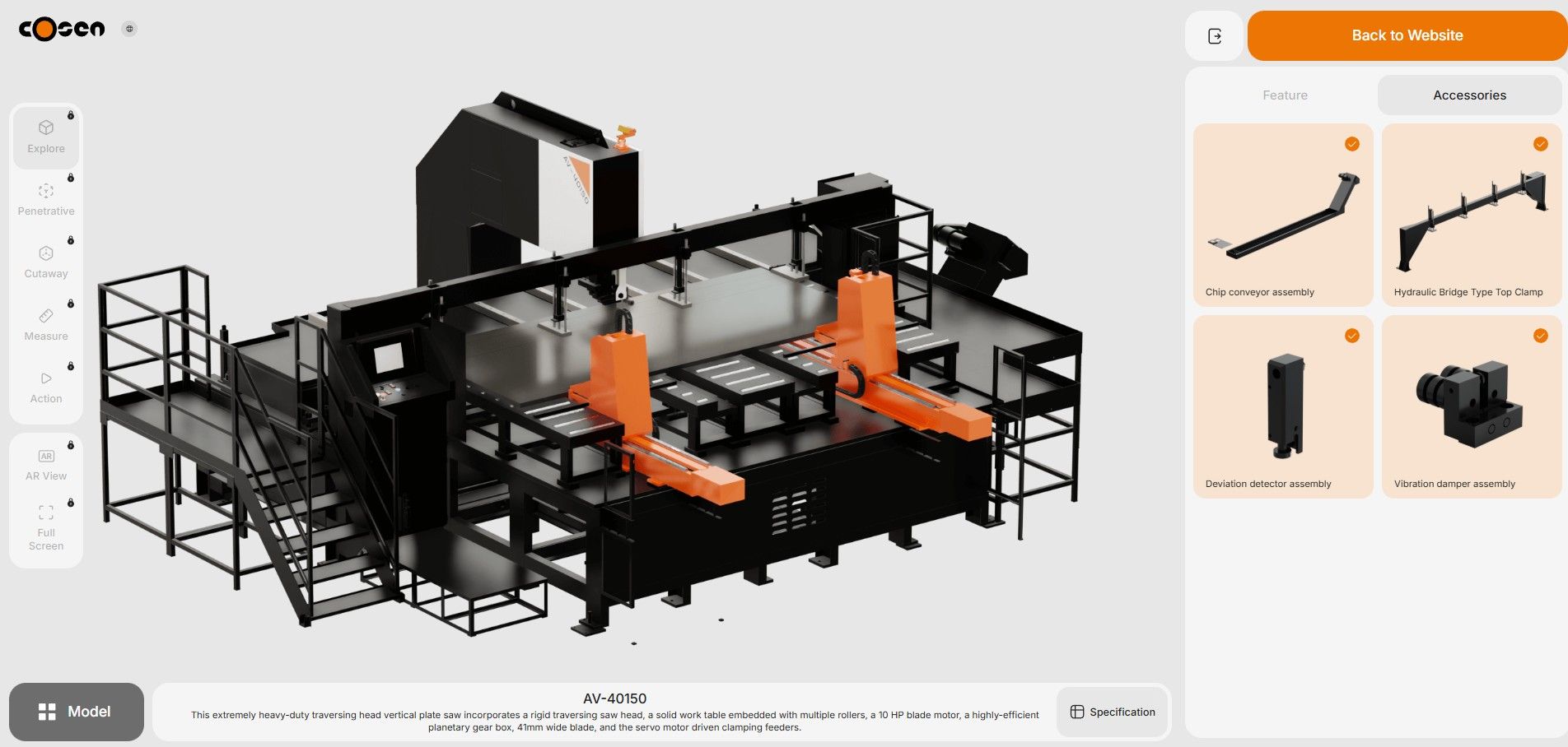 Das System bietet auch eine Echtzeit-Vorschau der Konfiguration: optionale Zubehörteile können ein- und ausgeschaltet werden und erscheinen oder verschwinden sofort im 3D-Modell. Dies ermöglicht es den Kunden, genau zu sehen, wie jedes Bauteil in das gesamte Maschinenlayout integriert ist – die Kommunikation zu verbessern, Unsicherheiten zu reduzieren und fundiertere Entscheidungen zu unterstützen.
